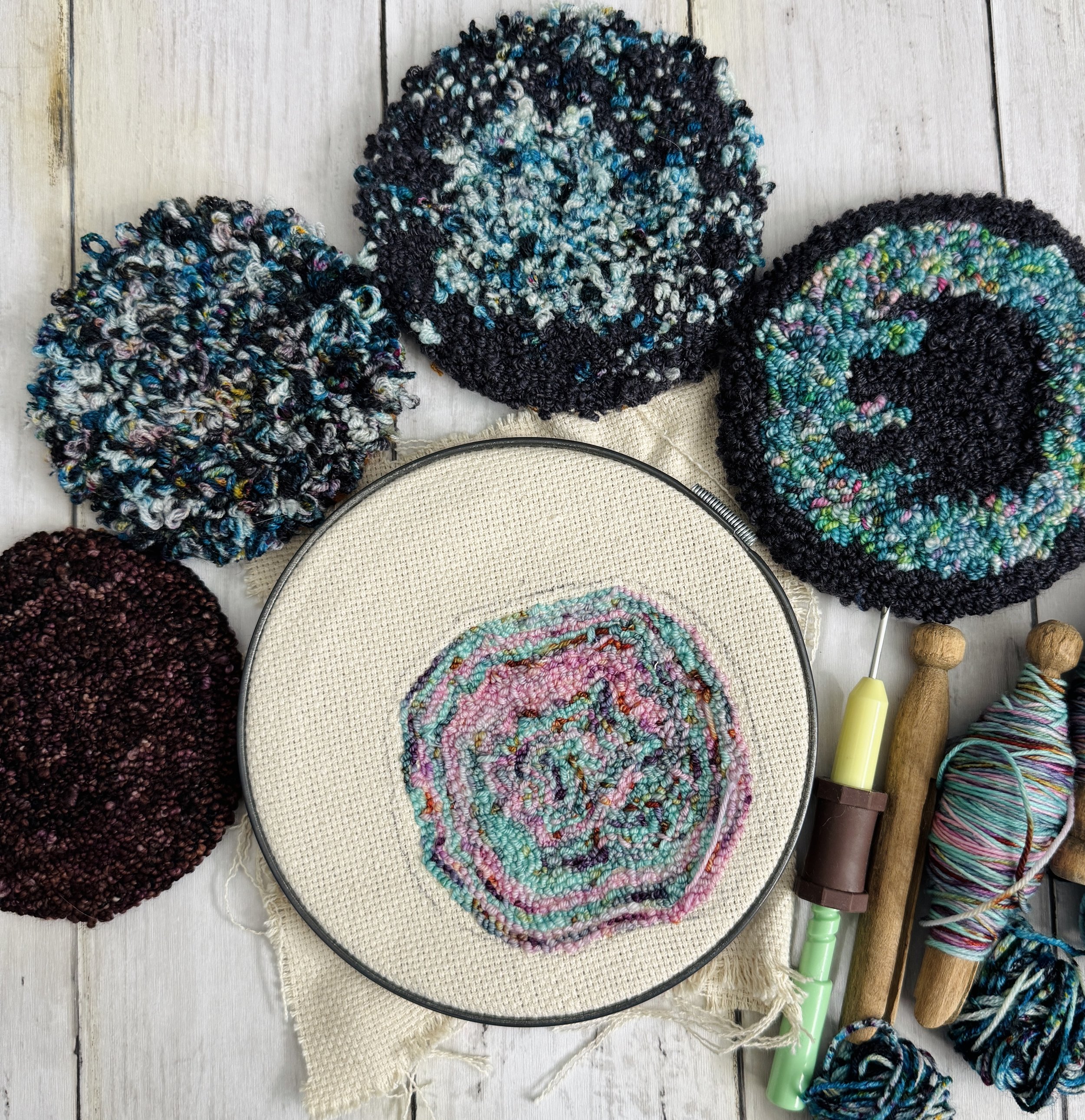 In this class, we will learn punch needle making a small but mighty coaster. These miniature canvases are the perfect way to master the fundamentals without the pressure of a large-scale project.
